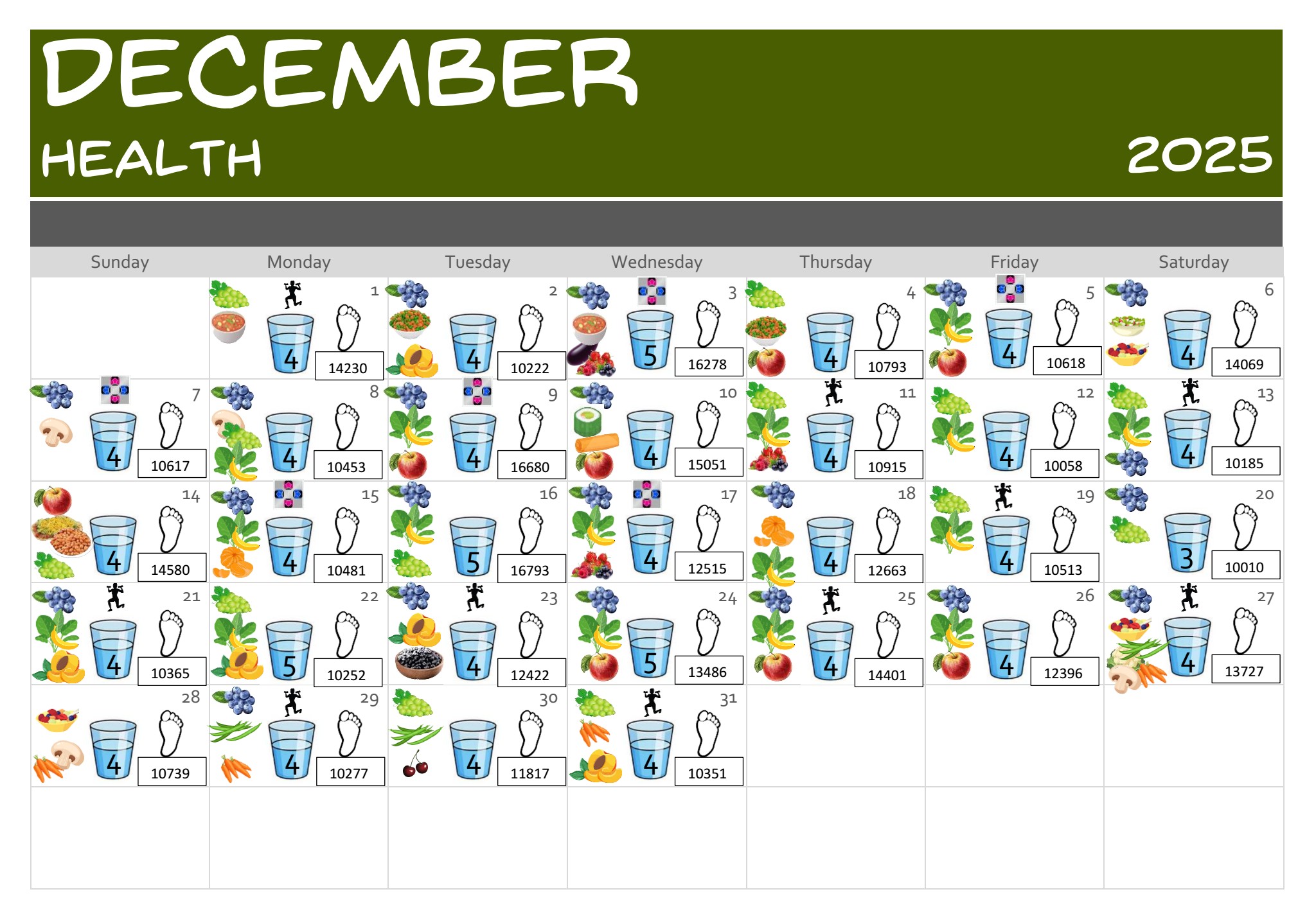 1. Health Goals: I resolved to continue drinking an appropriate amount of water (around 4 glasses a day), eat 3 servings of fruits and veggies a day and keep my nutrition balanced, and walk at least 10,000 steps a day plus add in an aerobic activity every other day.