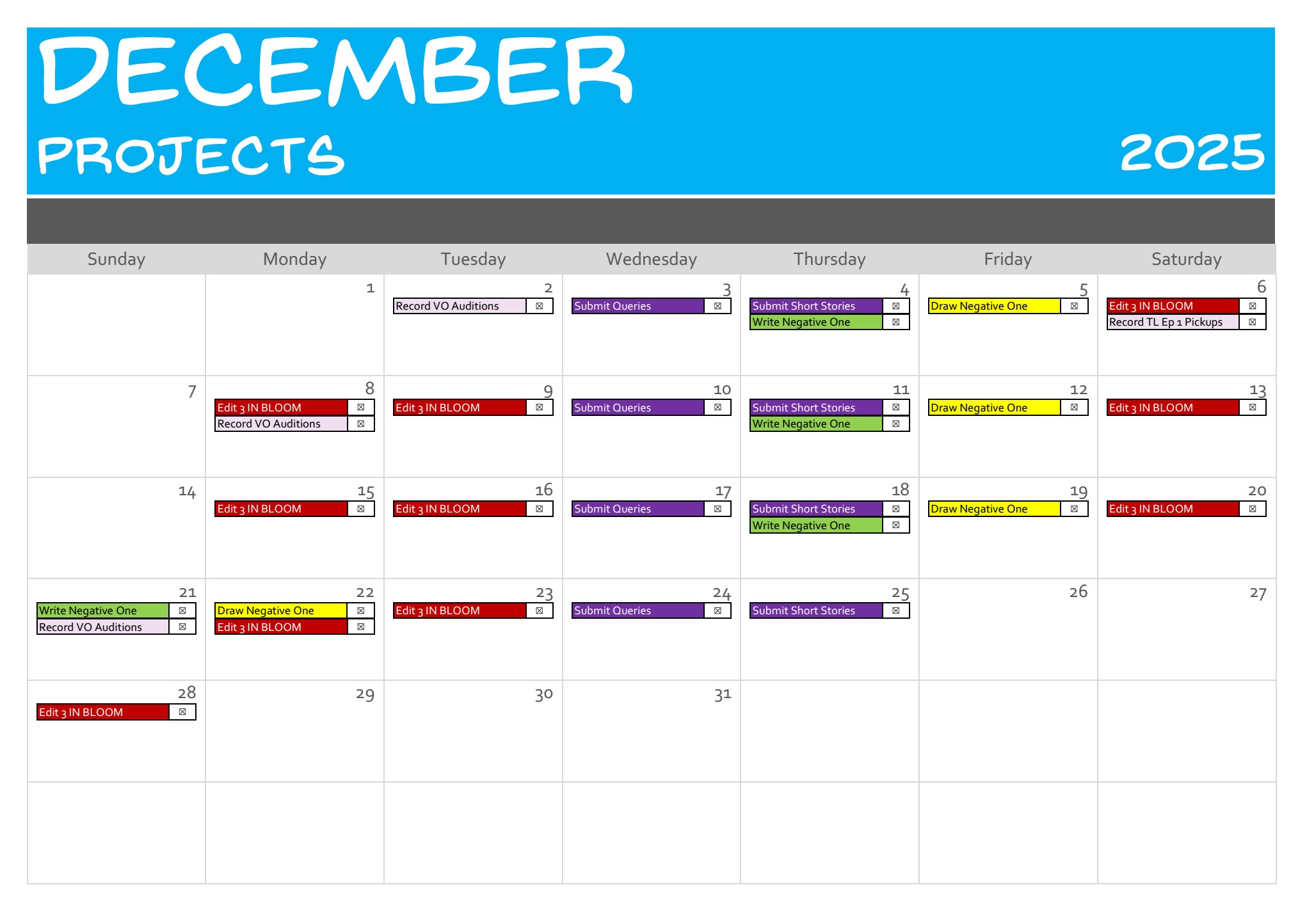 2. Personal Project Goals: I resolved to keep working on getting photos sorted as the first stop on a website rebuild; resolved to work on writing three days a week and submissions when I can; resolved to relearn ukulele songs I've forgotten and learn new ones, keep creating my regular webcomic and video content, and get some small voice acting gigs.