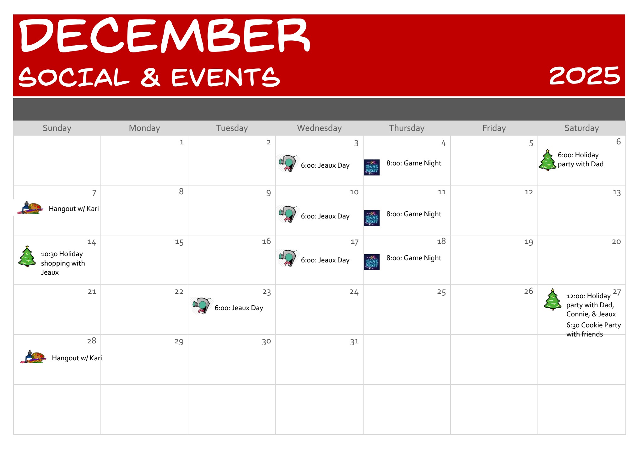 Summary: I've been doing Jeaux Day, Game Night, and hanging out with Kari here and there, plus a couple holiday parties and events. I haven't improved on the documentation goals I've had, but again I have a plan moving forward.
