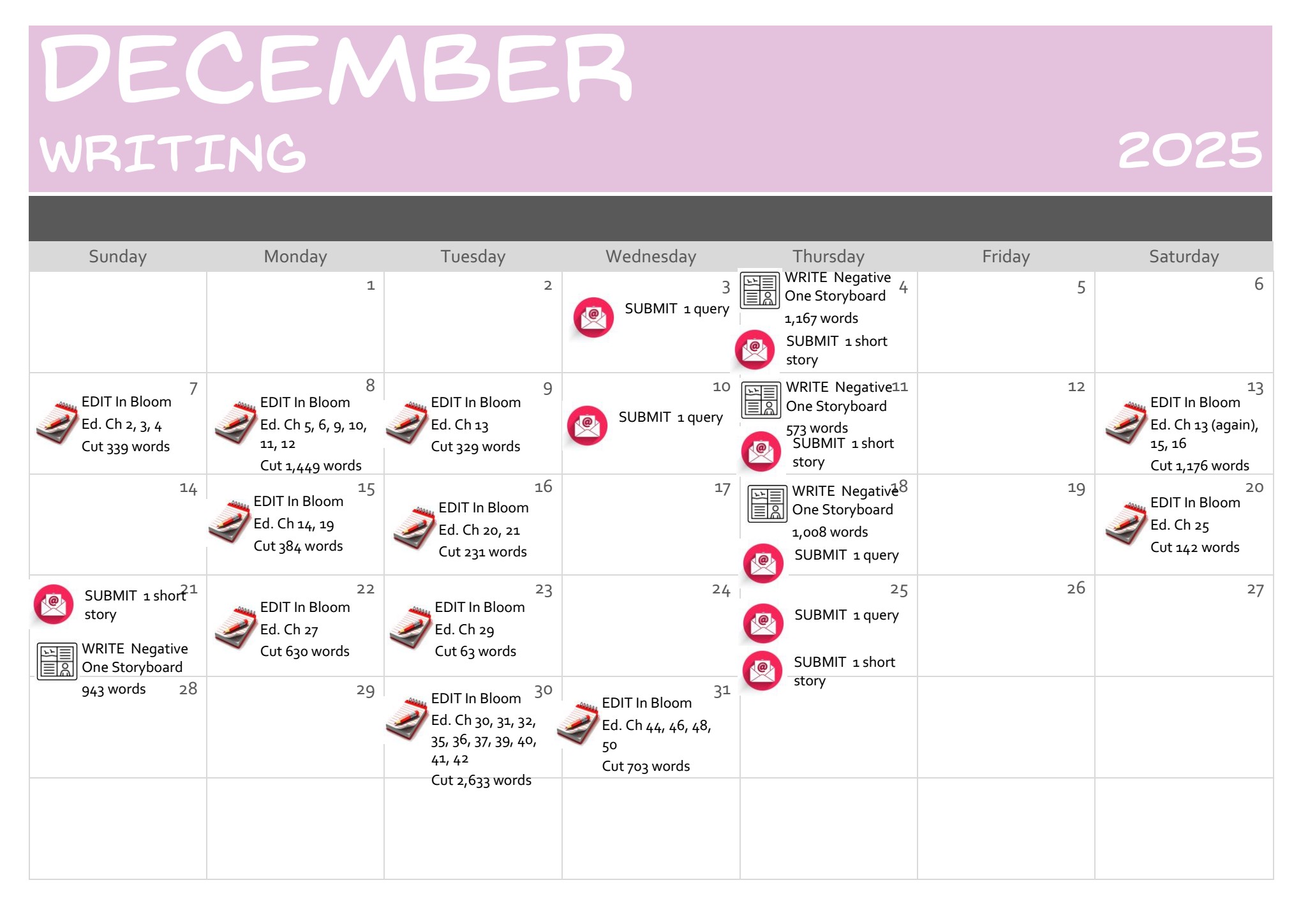 SUBMISSIONS: I've kept up submissions of queries and short stories. No news to share.