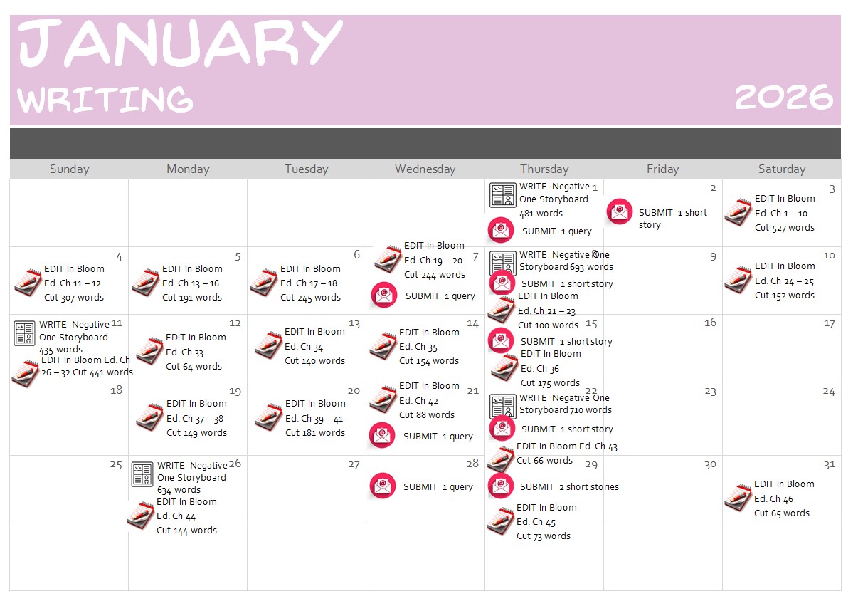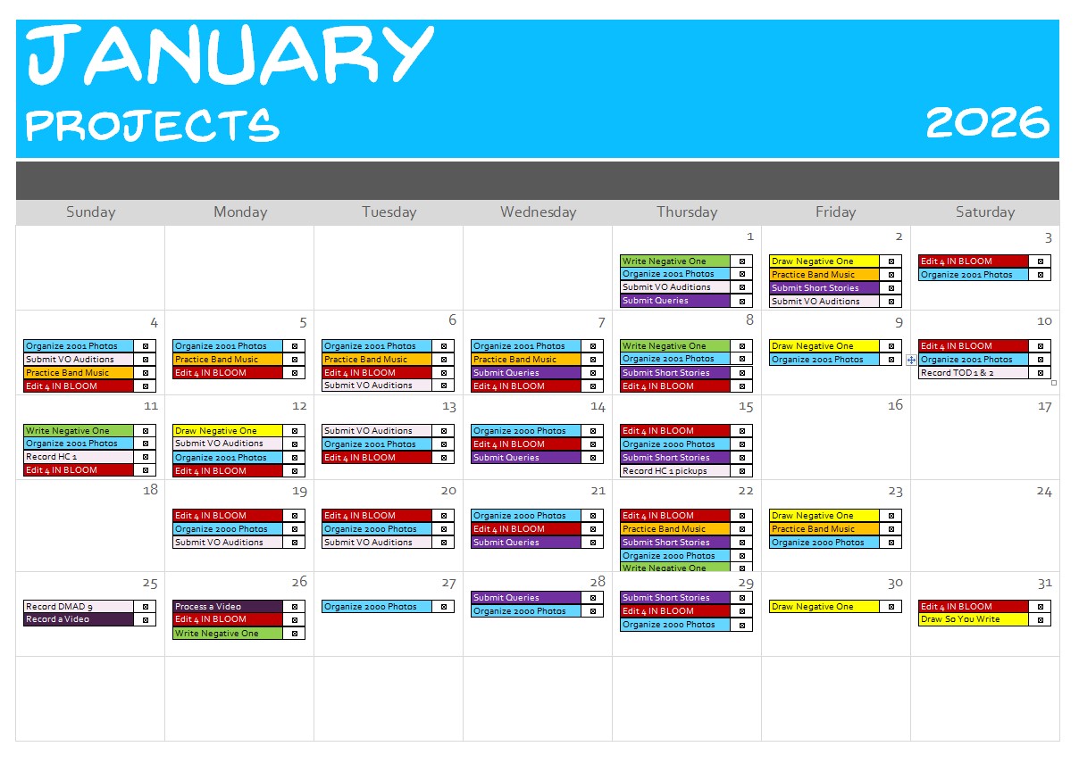 2. Personal Project Goals: Complete editing on In Bloom, share with test audience, collect and incorporate feedback, develop pitch materials, start querying it; start another book; write two more short stories; submit queries and short stories; finish the photo project and start the SU site, autobio site, and essays/rants site; practice music; post regular webcomics; post ace videos; submit voice-over auditions and complete assigned voice-over work.