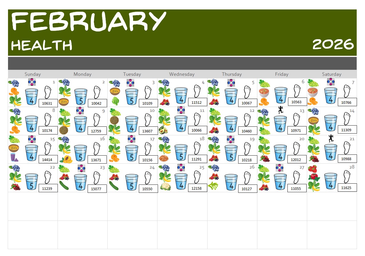 Here is my Health calendar of progress: