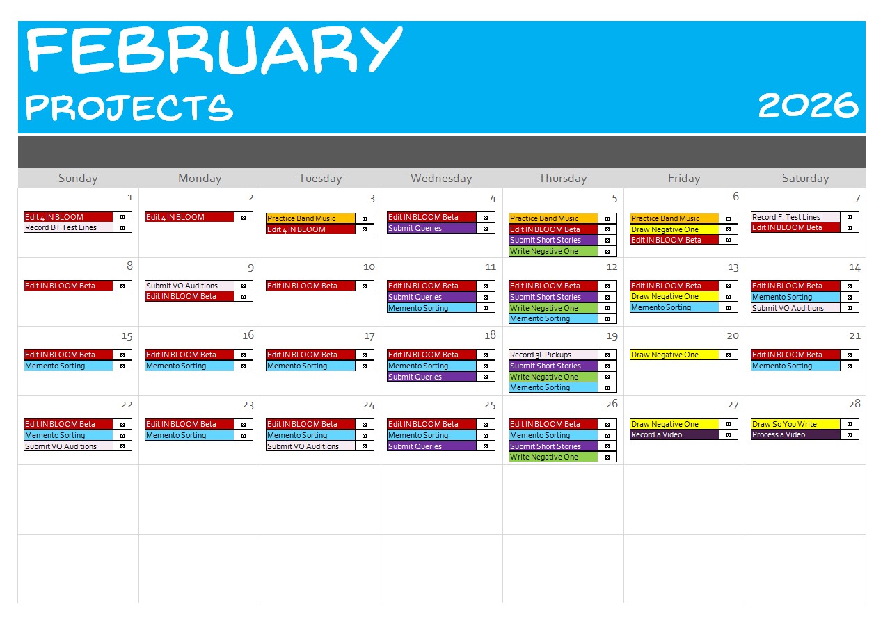 2. Personal Project Goals: Complete editing on In Bloom, share with test audience, collect and incorporate feedback, develop pitch materials, start querying it; start another book; write two more short stories; submit queries and short stories; finish the photo project and start the SU site, autobio site, and essays/rants site; practice music; post regular webcomics; post ace videos; submit voice-over auditions and complete assigned voice-over work.