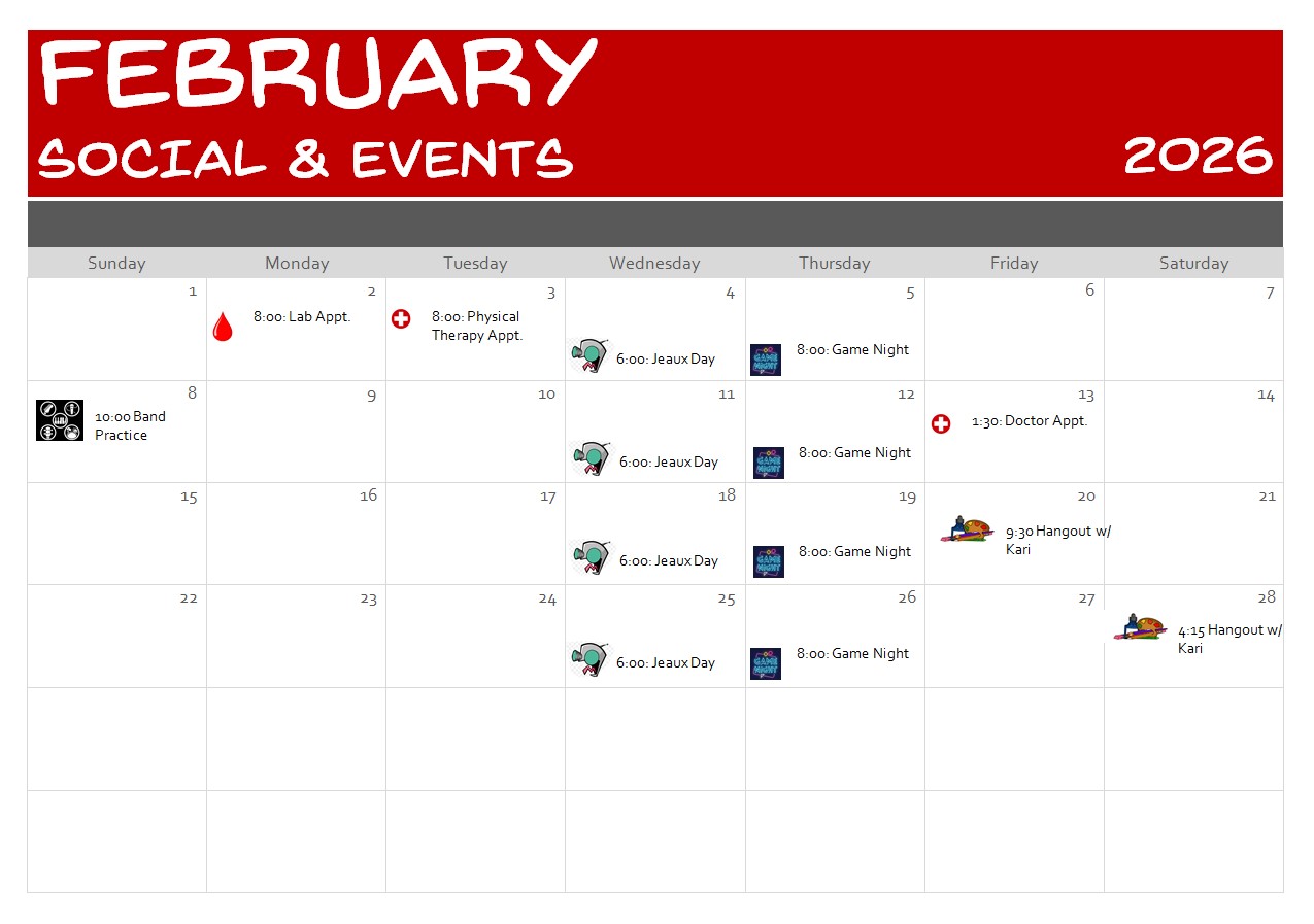 RELATIONSHIP AND COMMUNICATION GOALS:Summary: I've been doing Jeaux Day, Game Night, band practice, and hanging out with Kari here and there. Still only a couple posts about everyday stuff and I'd like to increase this but I've really fallen out of the habit. I have a couple issues I want to blog about and haven't done it yet (one about the recent beta-reading experience, and some follow-ups about my experience with ordering merch from Mexico).