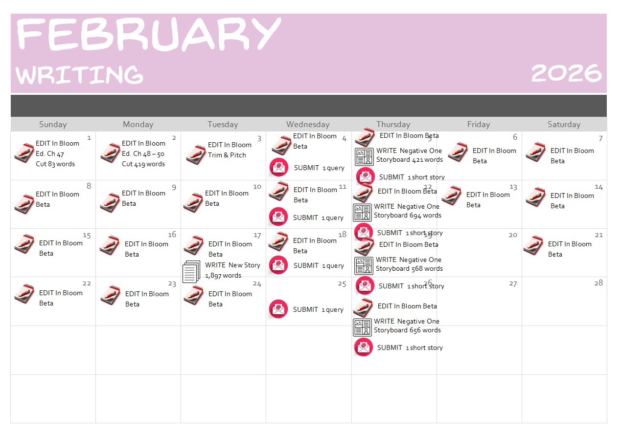 EDITING: We're into beta reading. I'm gathering and incorporating feedback from readers. I'm a little stalled on this because I have to wait for people to read and I can't rush that, but I'm working on incorporating some overall thoughts I got from early chapters to make sure I'm consistent throughout the manuscript. It's still just barely under 130,000 words and we need to keep it that way. I expect this month to mostly just be beta reader input, but I might work on pitch materials if I don't have feedback to work with. I've been very dedicated to the editing this month; I don't have assigned days, but I've been gravitating to it and I'm very excited about the project.