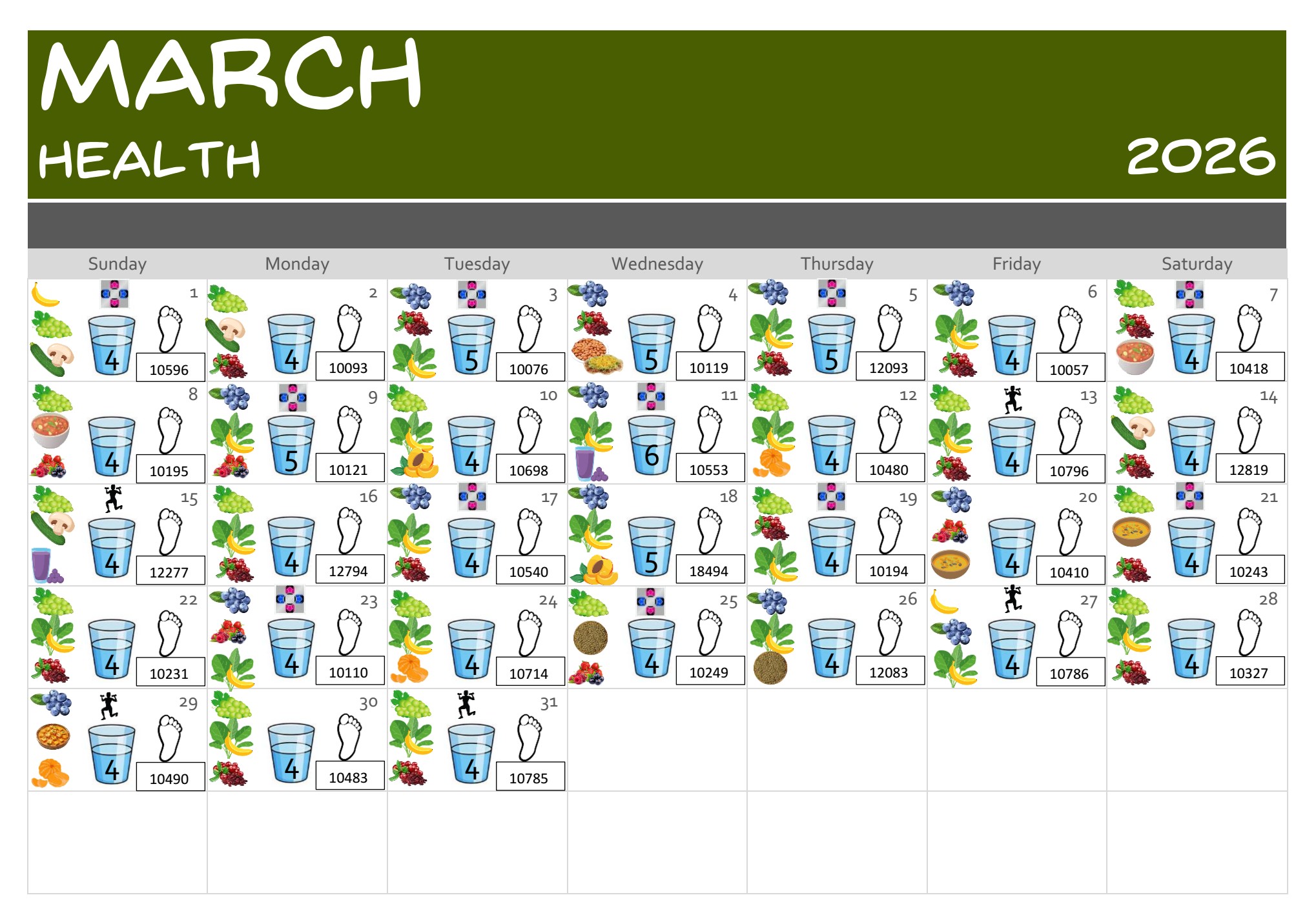 Here is my Health calendar of progress:
