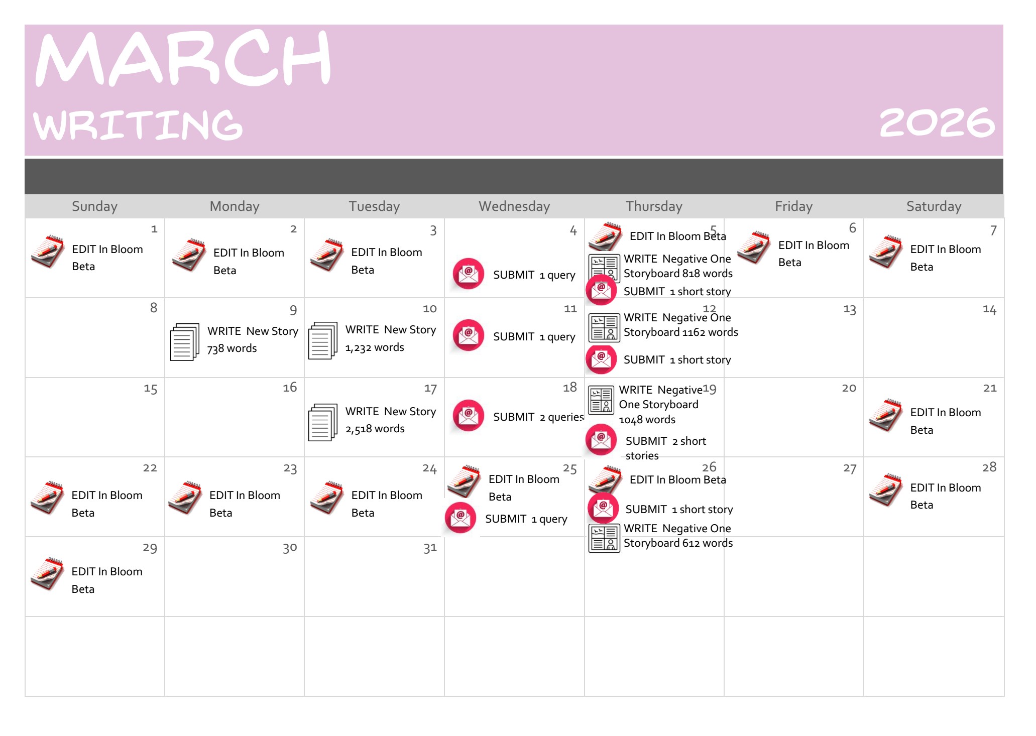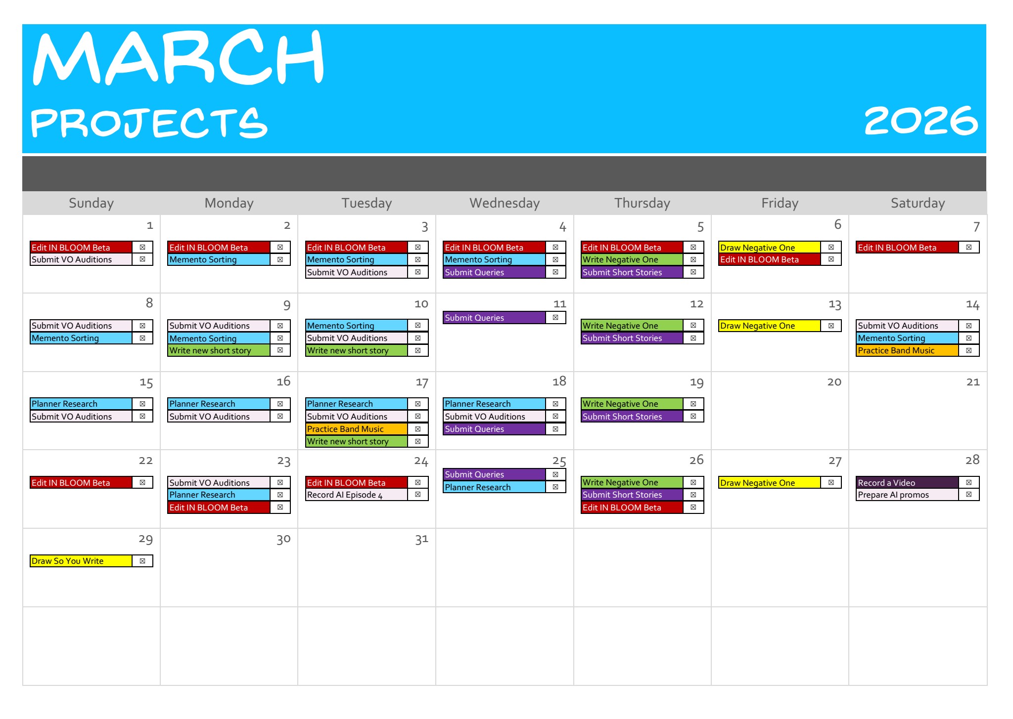 2. Personal Project Goals: Complete editing on In Bloom, share with test audience, collect and incorporate feedback, develop pitch materials, start querying it; start another book; write two more short stories; submit queries and short stories; finish the photo project and start the SU site, autobio site, and essays/rants site; practice music; post regular webcomics; post ace videos; submit voice-over auditions and complete assigned voice-over work.