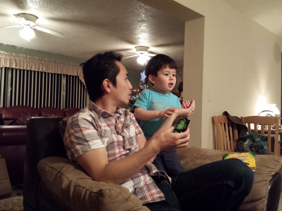 • Sunday was Christmas, so I went to my mom's again. I played with my nephew for a bunch of the morning--he can really tire you out. Then he went for a nap so Sister P and I chose a brownie recipe to make, made two-tone brownies, and played our ukuleles. Mike and Lindsay came over in the evening after dinner and we hung out some more and watched Ash play with toys. After the festivities, I had to go home and pack a suitcase, because . . .